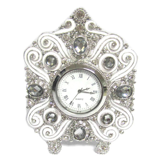 This pewter table clock is finely accented with shimmering stones for a decorative touch. The round dial face has three hands and a Roman numeral display. The modern and elegant design blends into any home nicely.