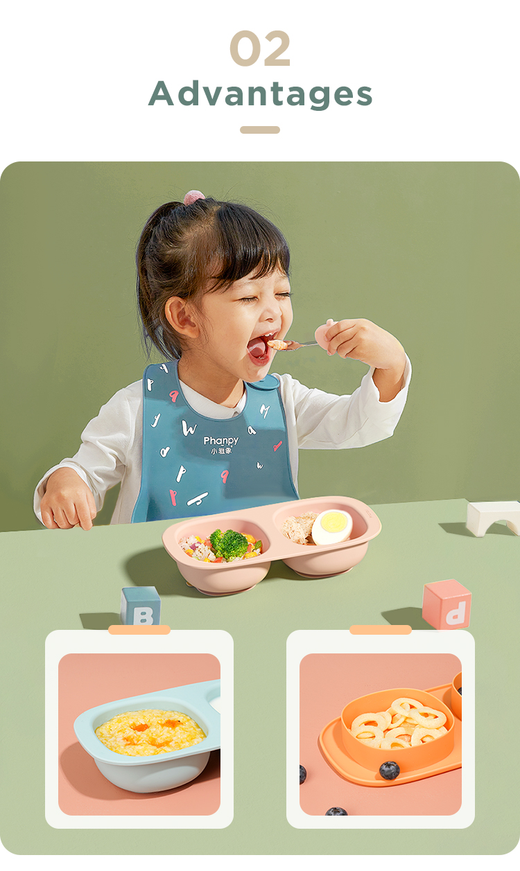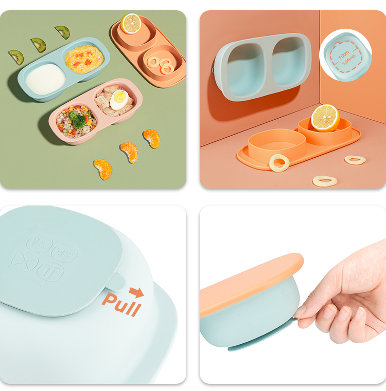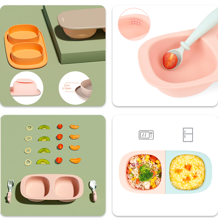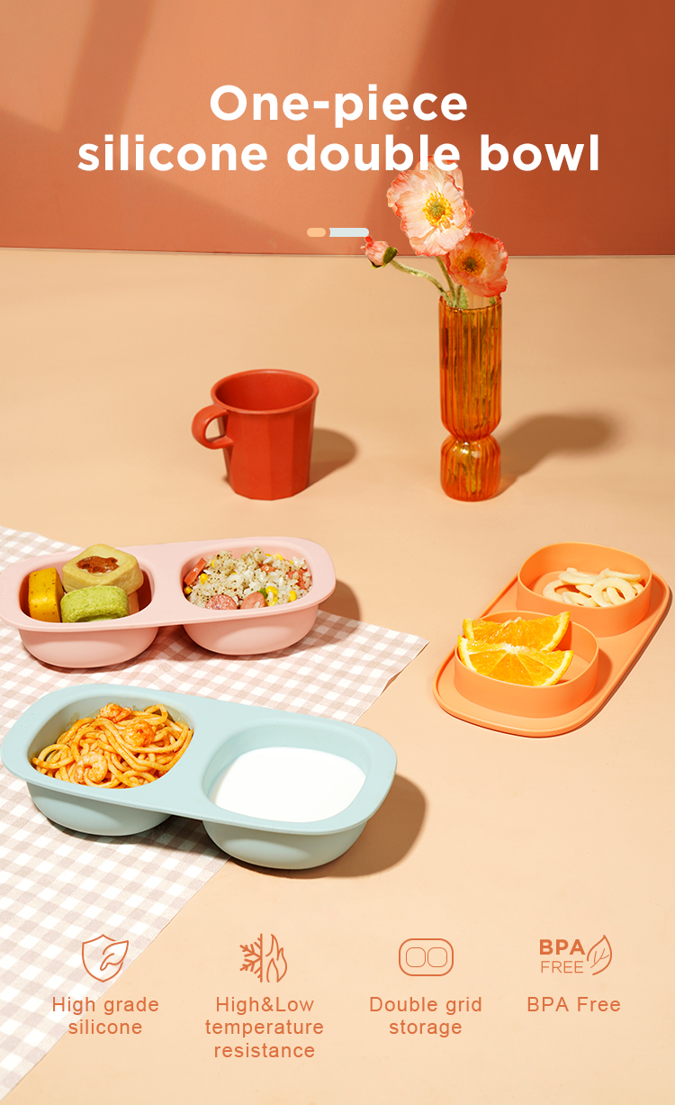 | Feature 1 | One-piece silicone double bowl, simple design to meet the needs of supplementary food, separate meals with different flavors |