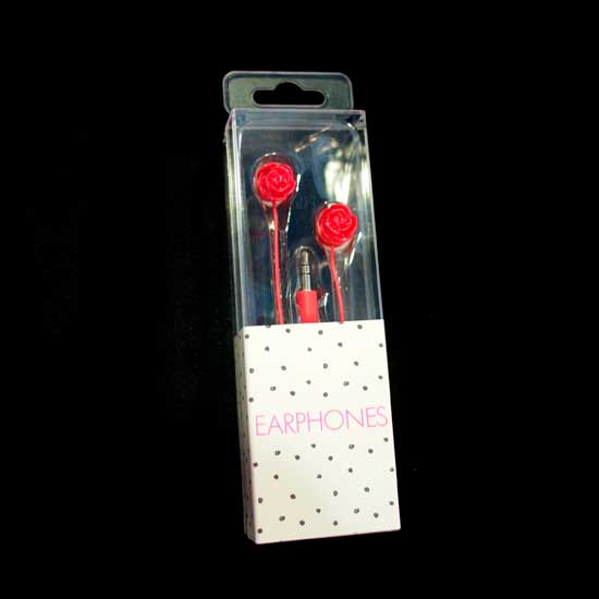 The displayed earphones snatch onlookers’ attention with its brilliant red toned appearance. The floral shaped design add spice to the look instantly. These beautiful earphones are compatible with iPhone and Samsung phones.