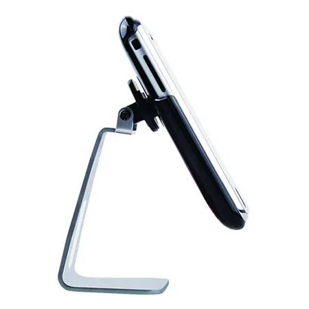 Displayed is a phone stand with secure construction. This piece stands stably with a single foot. It tilts your mobile phone so that you can operate it more easily.