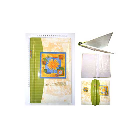 This rectangular photo album is characterized by a shiny printed cover with a picture of an orange sunflower. Embellished with green stripe patterns on one edge, the photo album gives a sense of brightness. With plastic sleeves, the photos can be kept in excellent condition for a long time.