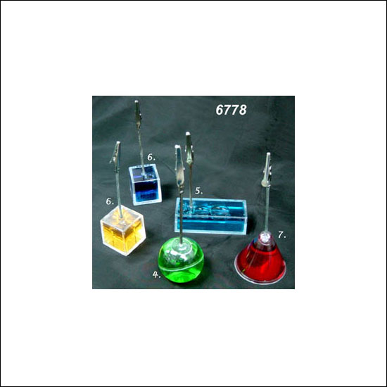 The memo holder features a transparent clear case filled with colored liquid. Four different base, including cube, cuboid, cone and sphere, are provided for selection. Each memo stand has an alligator clasp attached to it. Clip your notes or pictures with this unique holder!