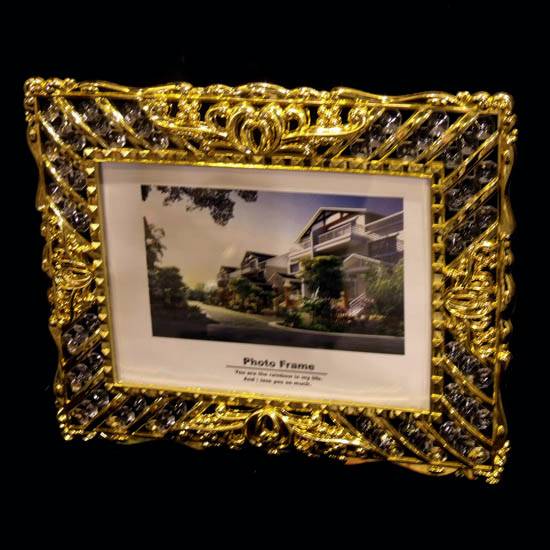 This is a refined photo frame with golden wires bended and carved into delicate patterns. It is decorated with crystals for a sense of glory. This photo frame is the best choice to show your wondrous memories.