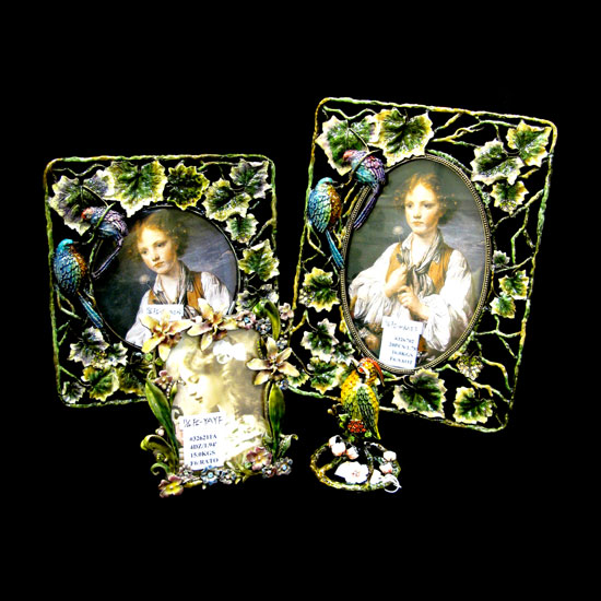 The items of this photo frame collection are constructed of rugged pewter alloy. The photo frames in portrait shapes are ornamented with tasteful natural trimmings. They are also refined and enlivened with various well-thought colors.