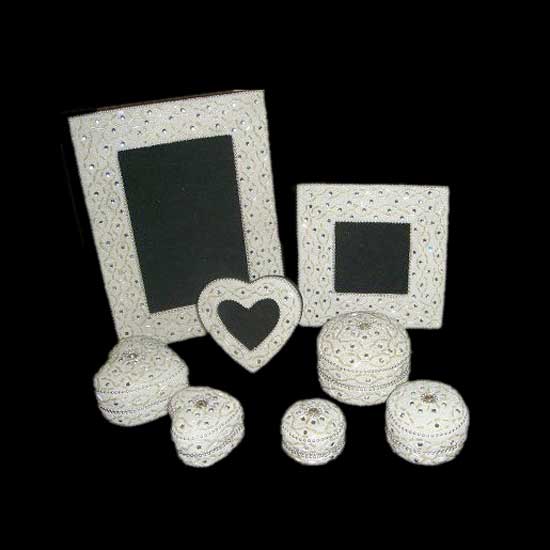 This is a collection of photo frames and trinket boxes with a matching design in different shapes of rectangular, square, round, sweetheart, etc. Each piece is designed with a pure white cover that is accented with shimmering beads. The exquisite craftsmanship makes these pieces ideal for brightening up your home furnishings.
