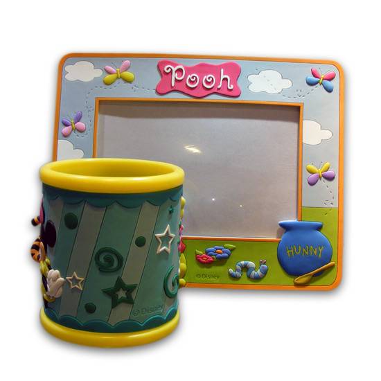 The photo frame and the mug are made of soft PVC. The photo frame is decorated with butterflies and it is perfect to be placed on a desk. The mug is designed with a handle for easy holding and it is suitable to use at home, office, school, etc.