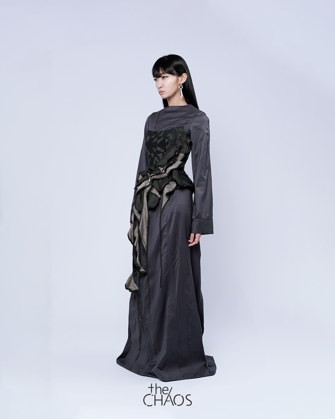 Photographic memory inspired upcycled pearl beadings details evening dress in deadstock tailoring fabric and beadings.
