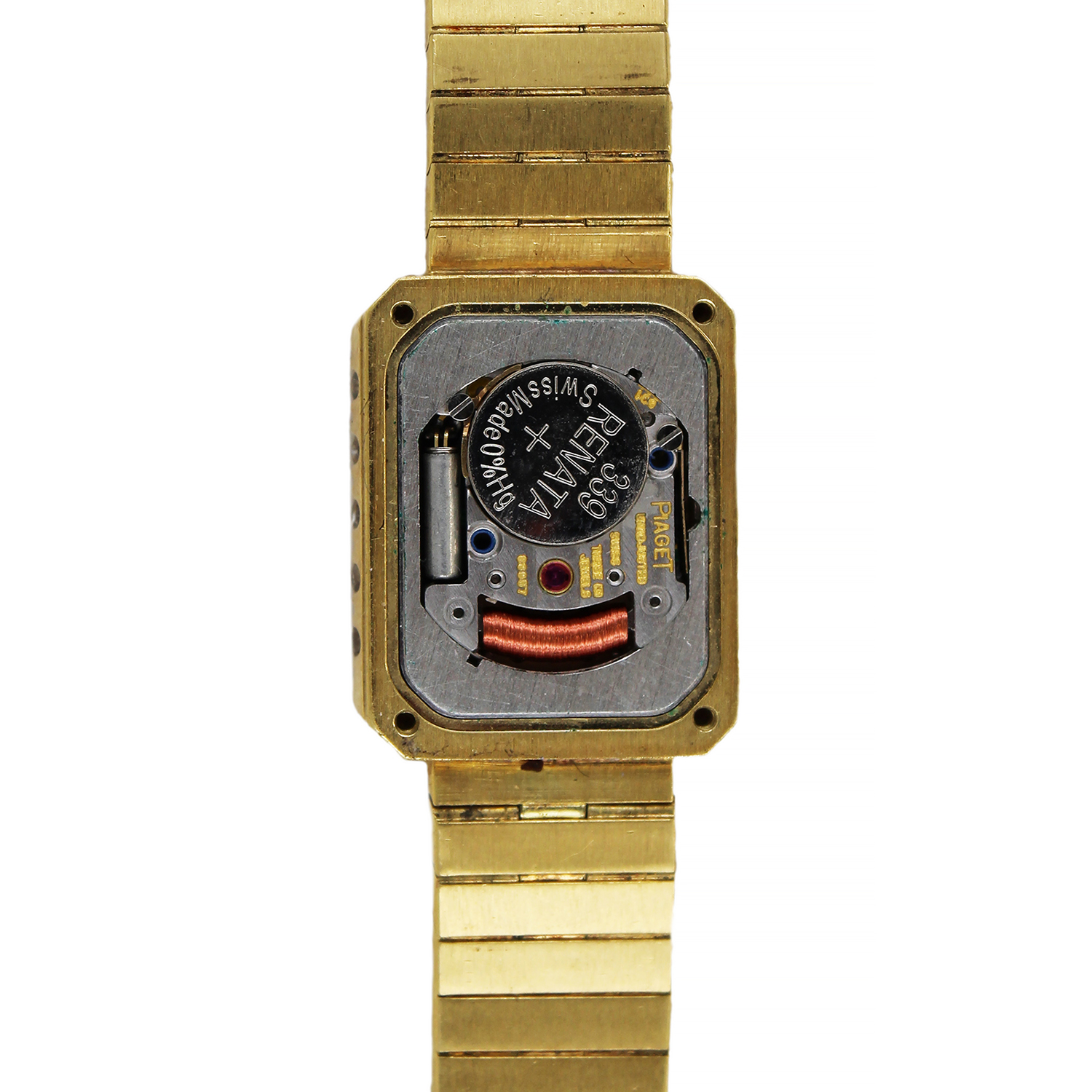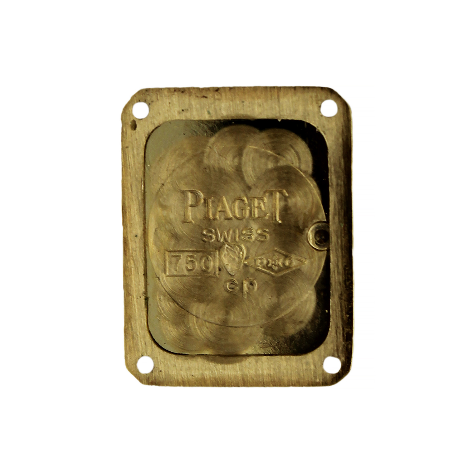 Case: Signed, rectangular, 18k yellow gold case no. 449153 measures 15 x 18mm and features a diamond-set bezel, and button to set time on case-back secured by 4 screws.