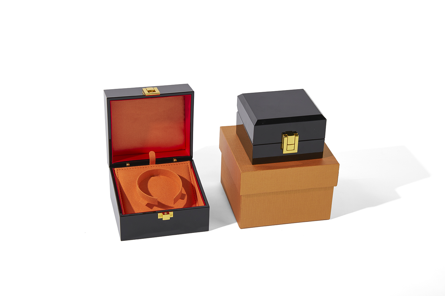 Piano lacquer jewellery box with clasp closure, exuding a premium feel. Customisable in colour, interior lining and logo.