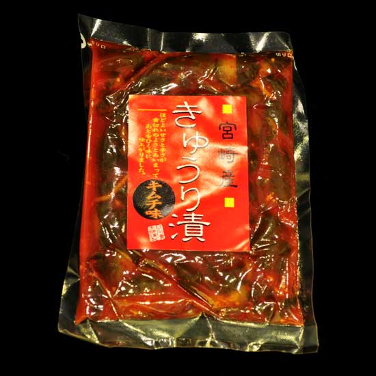 Featured is a pack of pickled cucumber with a kimchi flavor. The cucumber is pickled with soy sauce, sugar, high-fructose corn syrup, sugar, brewing vinegar and many other ingredients. The appetizing cucumber makes a great choice of side dish.