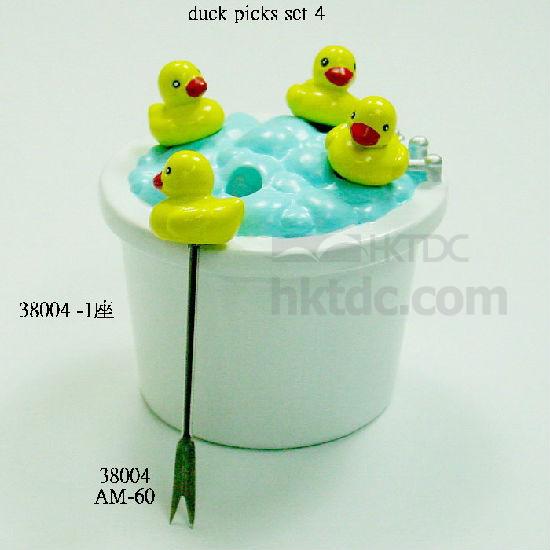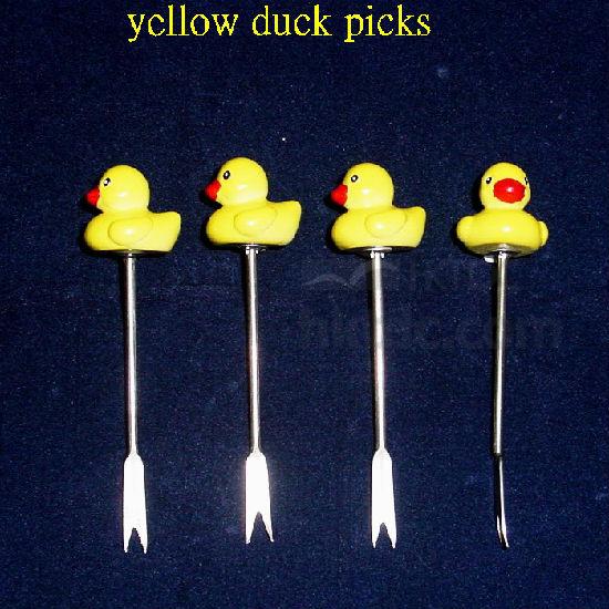 4 pcs stainelss steel picks with yellow duck design polyresin handle handle and bathtub design stand