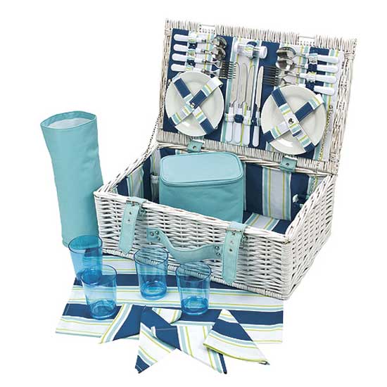 Enjoy a relaxing picnic outdoors with this delicate picnic basket. The basket comes with all sorts of tableware needed in a picnic, such as cups, dishes, forks, spoons, etc. The white-and-blue match exudes a strong summertime style.