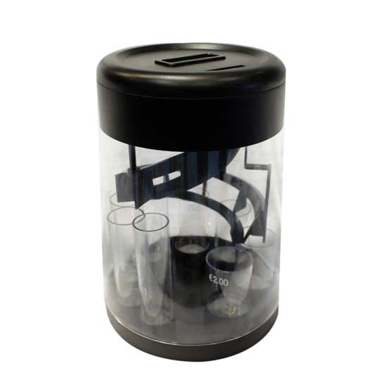 This cylindrical piggy bank features a black and transparent design. It comes with a spiral detail and transparent tubes inside the box. This novel money box makes a great addition to your desktop.