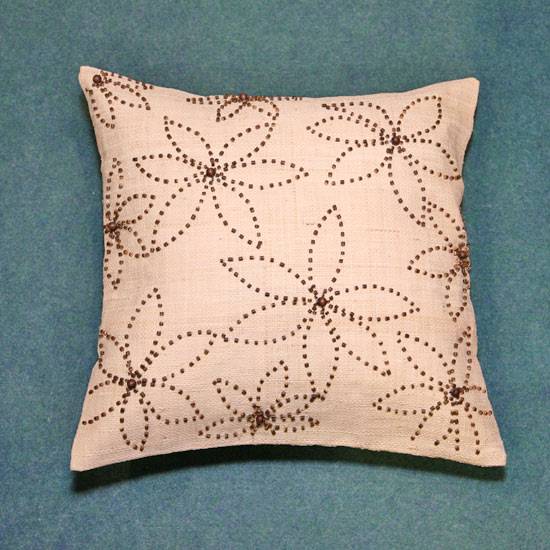 The featuring item is a pillow made of natural material. It has a flower pattern combined with dots on a beige ground, creating an ethnic and botanical look which is great for home and interior decoration.