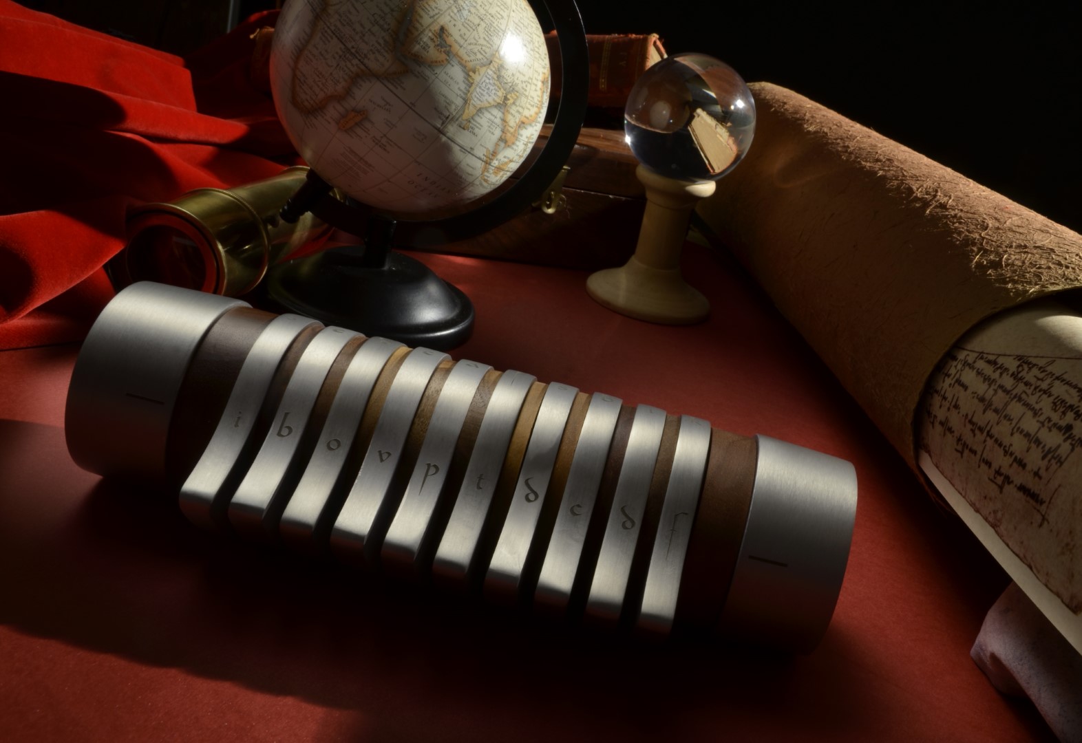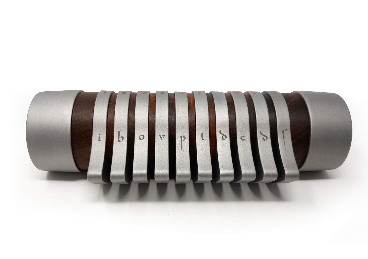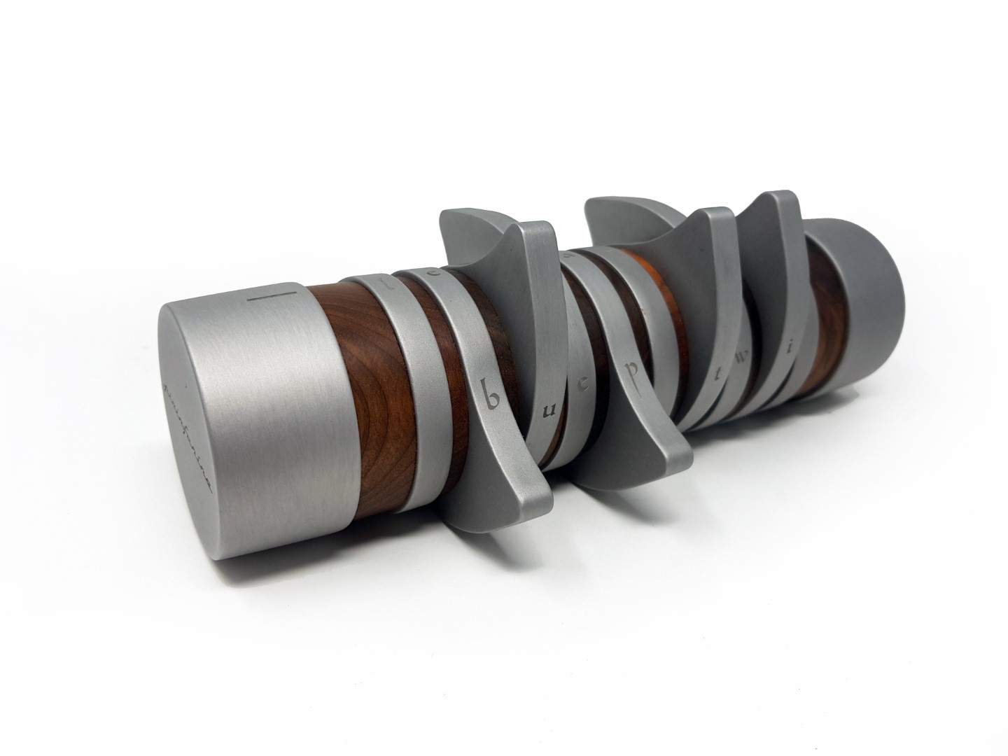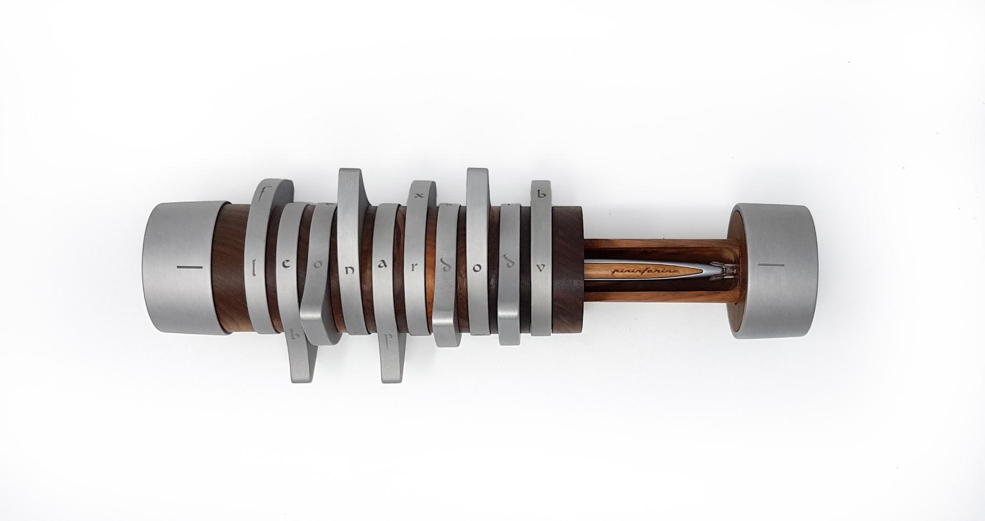 A coffer able to enclose an object, preserving it as a precious treasure, far from the eyes; an iconic product that completes a design desk, giving it an elegant and mysterious character. The Codex structure combines the purity of Aluminum with the essentiality of Walnut wood, to form a cylinder. Inside the cylinder can be accessed only by aligning the letters in the right sequence, going to compose the secret code that seals the content. It can contain a Pininfarina stylo or other valuable information, or small personal items, making Codex a real design coffer, refined and elegant.