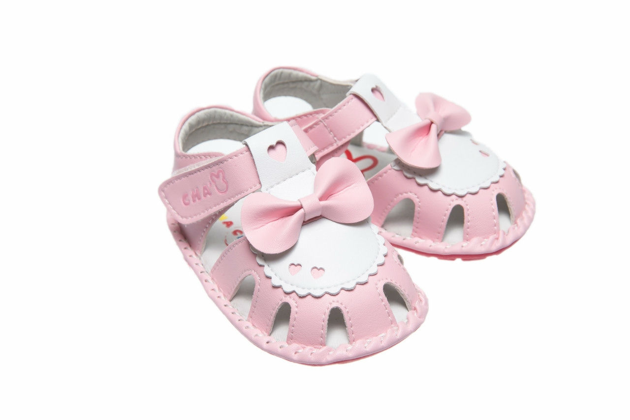 Boost a sweet touch for your baby’s outfits with these lovely baby sandals. Each sandal features a T-strap in contrast colors, heart-shaped hollows and a 3D bow, adding stunning details to the simple design. These shoes offer protective care to your babies with the soft foot beds and non-slip soles. These shoes are sure to add charm to your baby’s casual look.