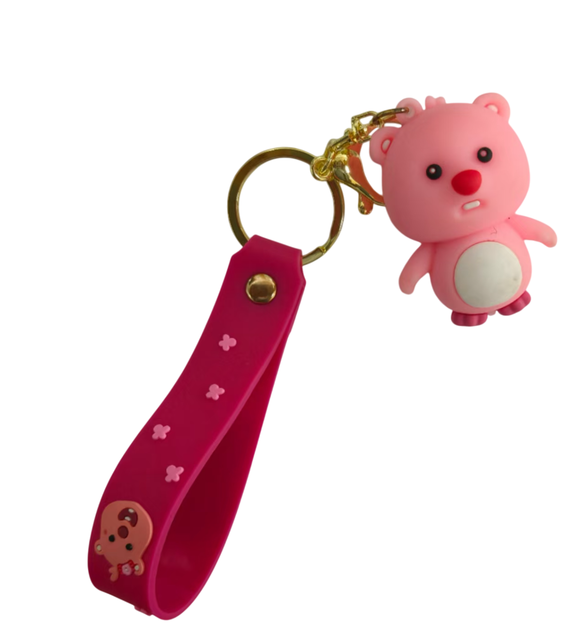 Design inspiration: Bears are often symbols of cuteness and warmth in popular culture. The design of this keychain, with its bright pink color and simple, endearing bear shape, aims to capture these positive associations. The small star patterns on the strap and the bear's round, friendly appearance are intended to appeal to those who have an affinity for cute and charming accessories, providing a touch of playfulness and warmth to everyday items.