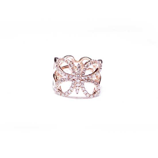 Presented is a ring that stuns the party with the fine construction of 18K rose gold and pink diamonds. The butterfly design suggests a touch of modern romance. The warm glow from the rose gold and pink diamonds makes a pleasant picture.