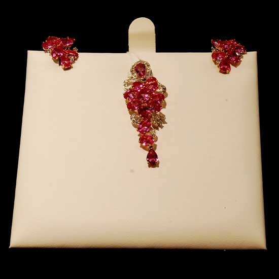 Showcased is a pink-sapphire jewelry set including a pair of earrings and pendant. The dazzling diamond accents offer added elegance and sparkles. This pink-sapphire jewelry set is easy to mix and match your evening outfit.