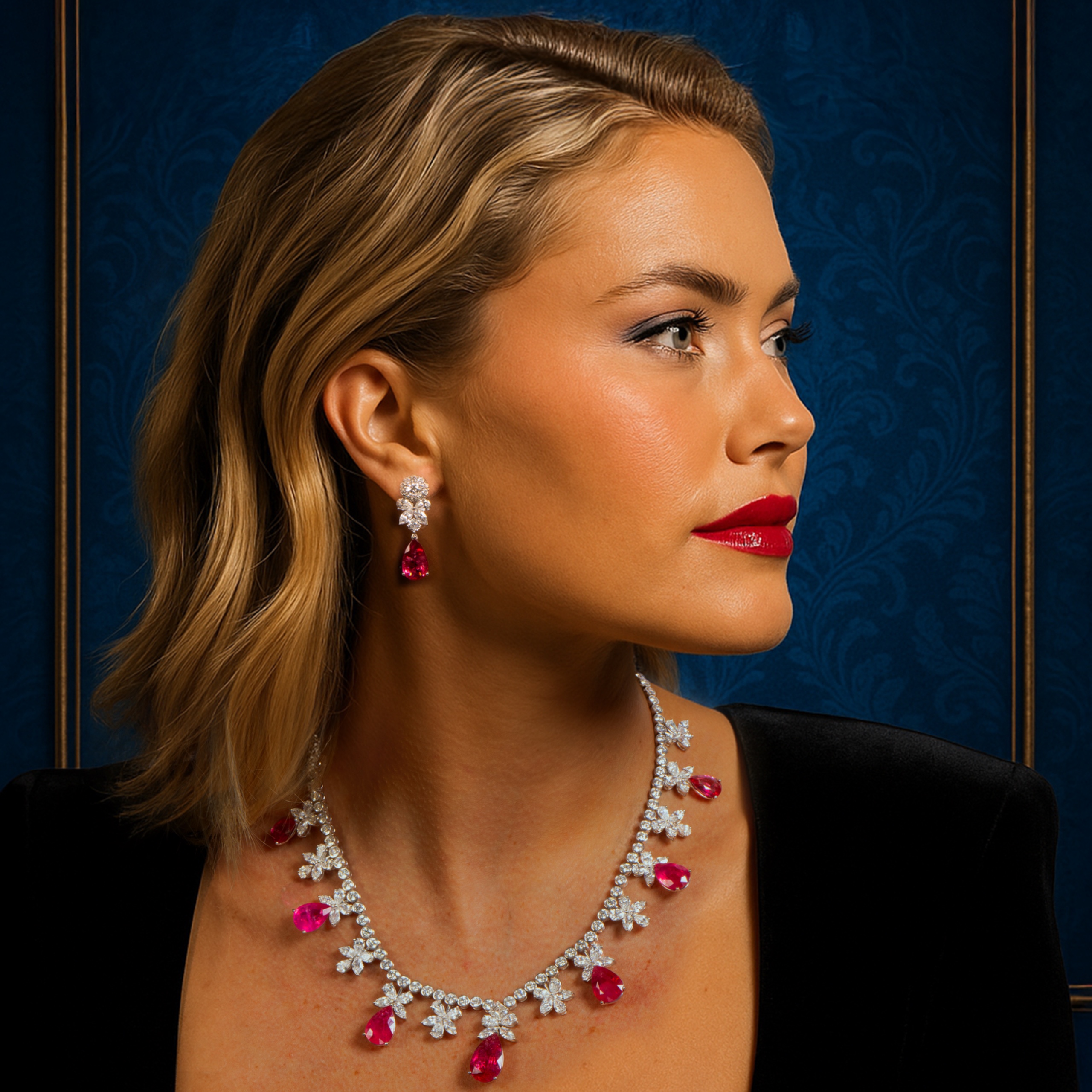 Stunning floral necklace and matching earrings adorned with vibrant rare pink spinels and sparkling diamonds in 18K gold