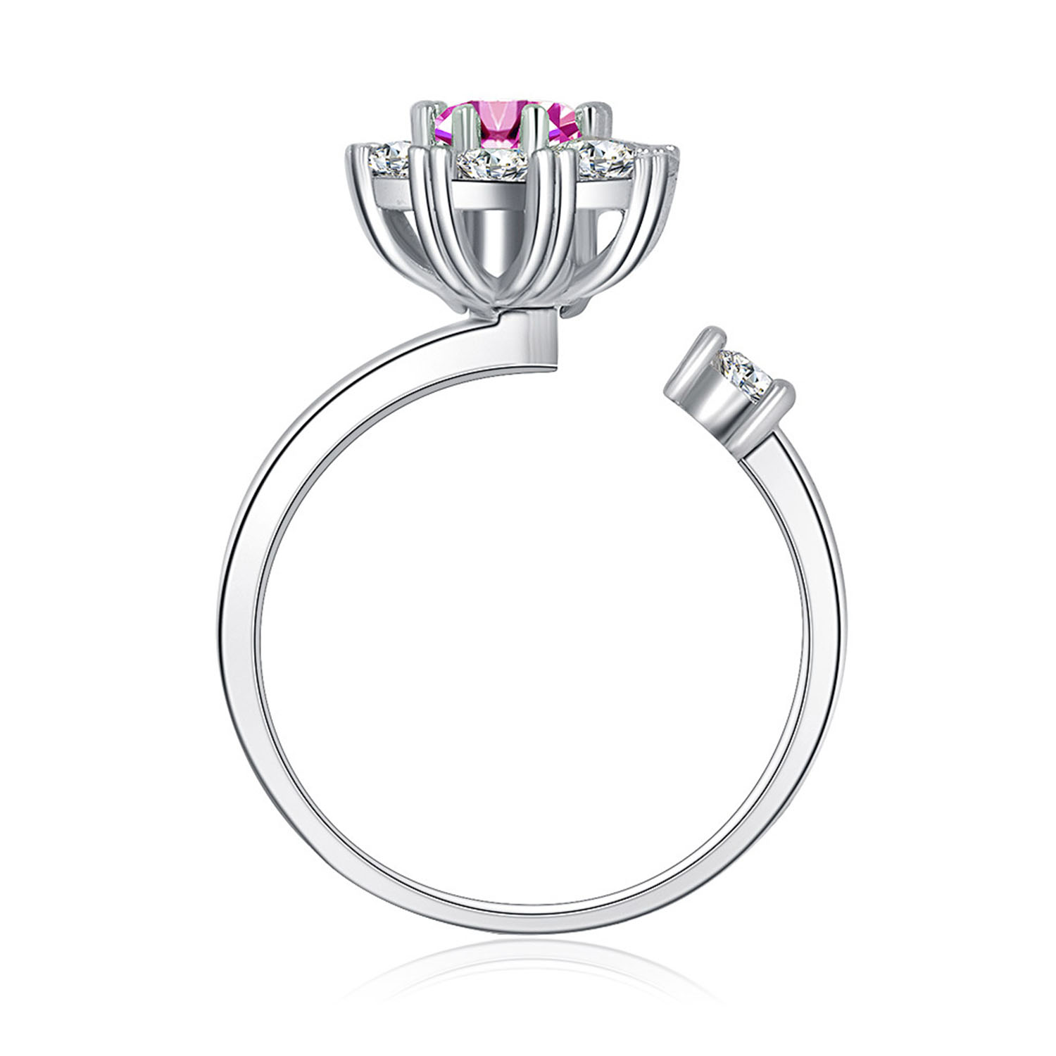 Pinky Flower Spinning Ring - A white gold cluster ring where the center stone is given a pave-set halo with Pink CZ and a window cut-out in the short mount underneath. The centerpiece actually spins! Let's bring on the spin to common beautiful static rings!