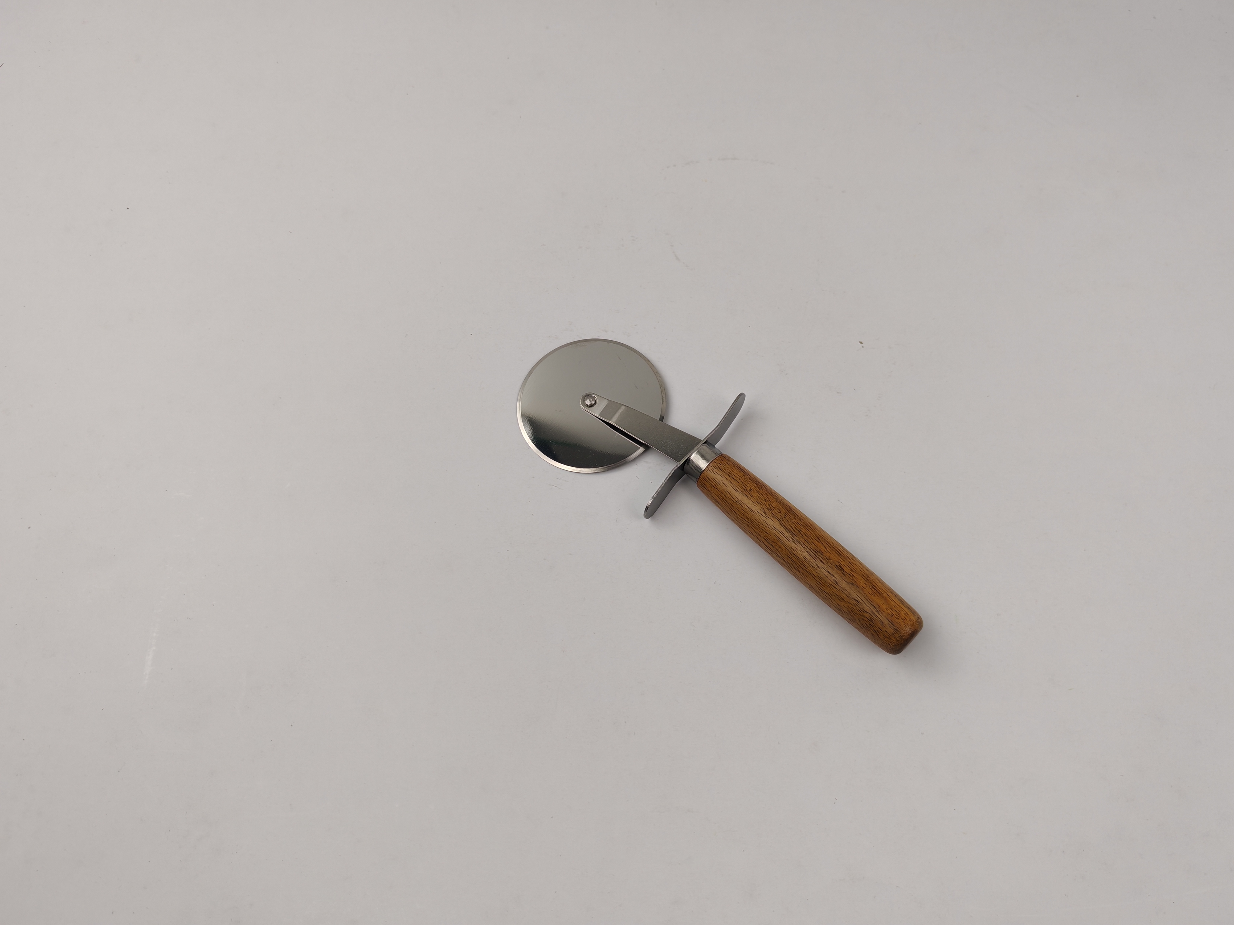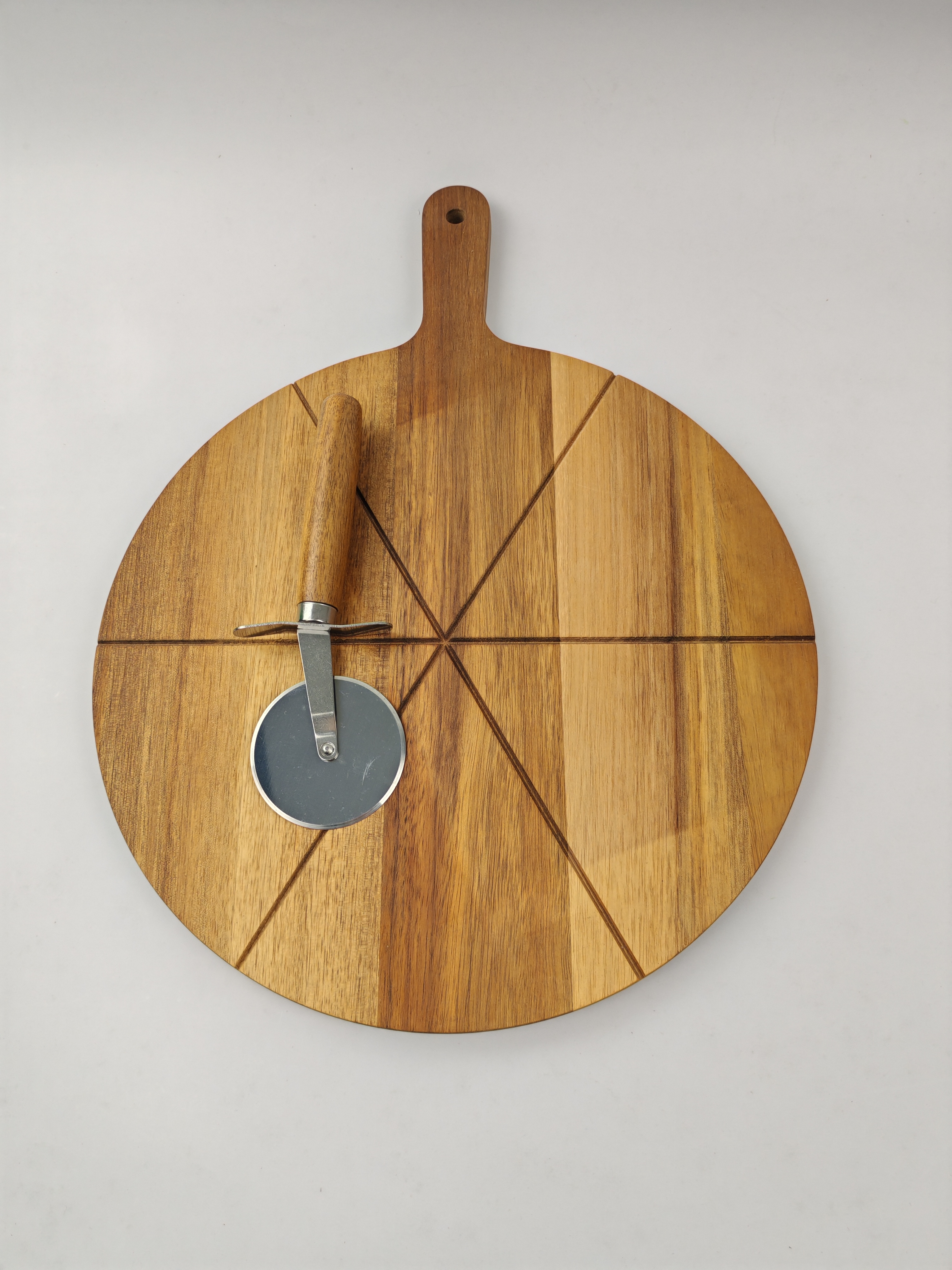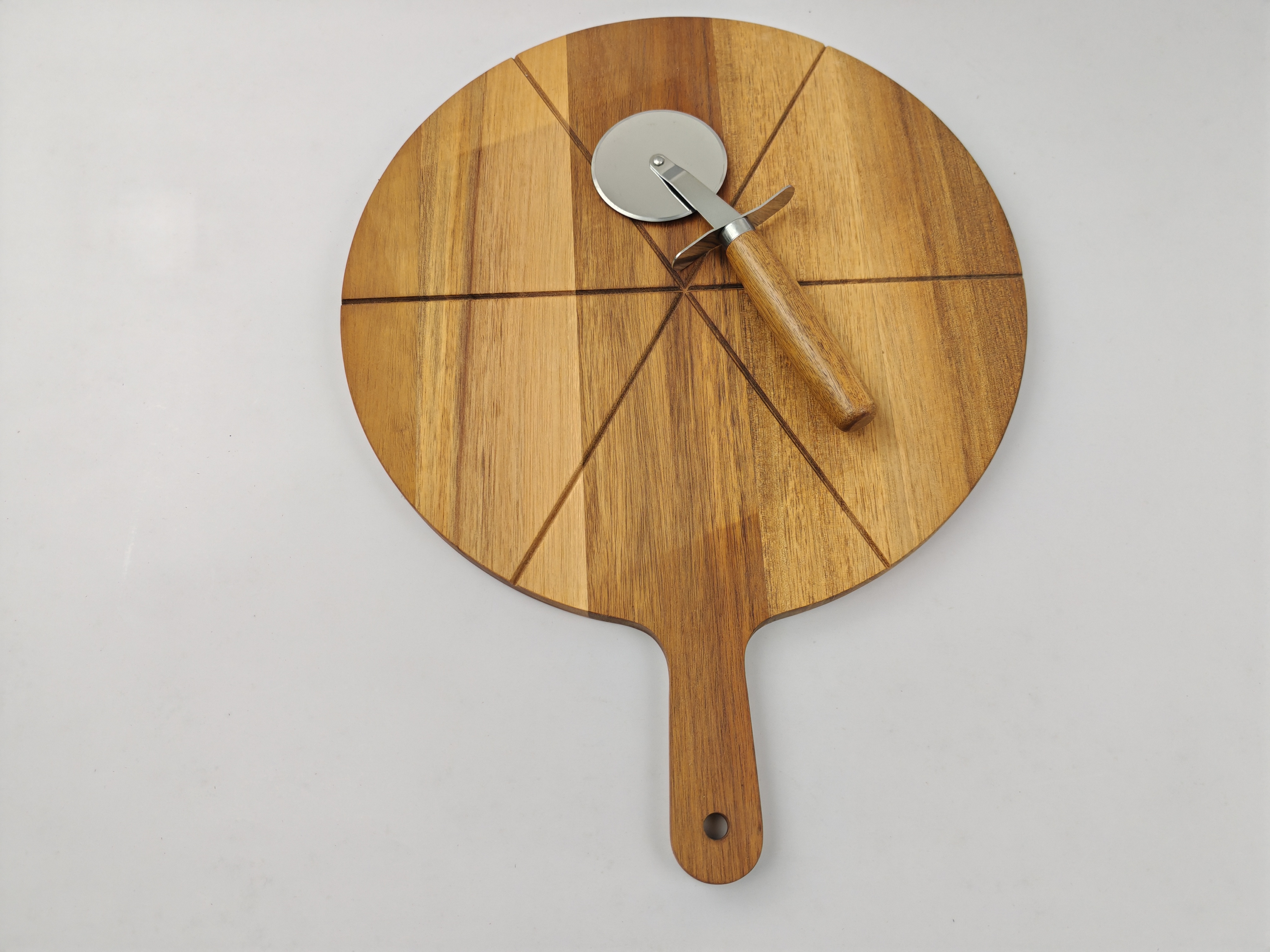 YSS-2667 Pizza kit with acacia wood cutting board and stainless steel cutter, 784g total, ready for pizza parties.