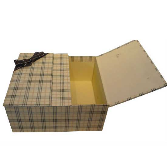 This charming gift box is designed in elegant plaid patterns in beige and black. It features a double-flap design for extra detail. A black ribbon bow at the corner decorates this gift box.