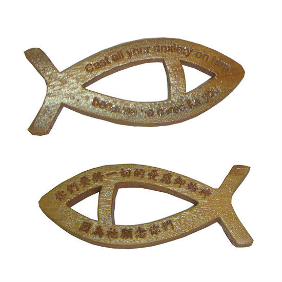 A delightful wooden outline gives this fish pair a sturdy construction in great style. With its custom etched text and polished surface, each of these mini plaques serves as handy badges and adorable figurines for your outfits and home adornments.