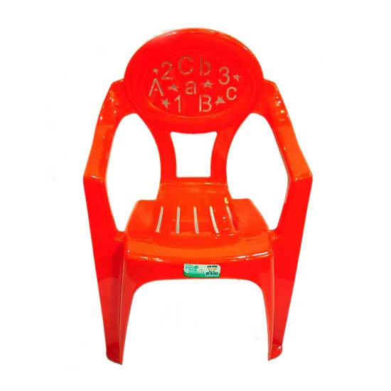 This stylish plastic arm chair features a bright red exterior. The chair seat back is designed with cutout Arabic numbers and English alphabets for added appeal. This eye-catching arm chair is a perfect addition to your living room, backyard or porch.