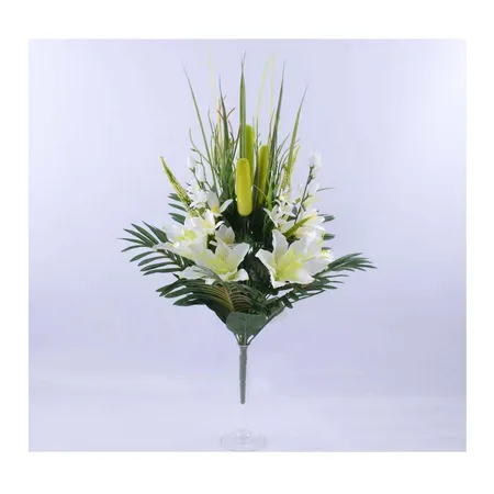 The plastic artificial flowers lily orchid bridal bouquet.