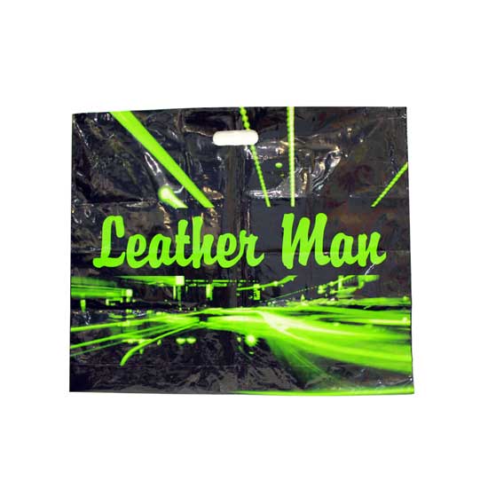 This glossy bag with cutout handles features abstract patterns in green and black. It is made of plastic to withstand long time tear and wear. This cool plastic bag is great for packaging your goods.