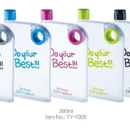 This plastic bottle comes in the design of a book and is embellished with inspirational messages on the exterior. It has a offers a capacity of 380ml and has a loop at the corner for convenient carrying. The plastic bottle is easy to store inside bags and can provide convenient access to hydration.