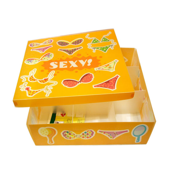 This plastic box comes in a square shape in invigorating yellow. The exterior is skillfully printed with beautiful bikinis in assorted colors, conveying a girlish touch. The interior is crafted with 9 compartments for organized storage.