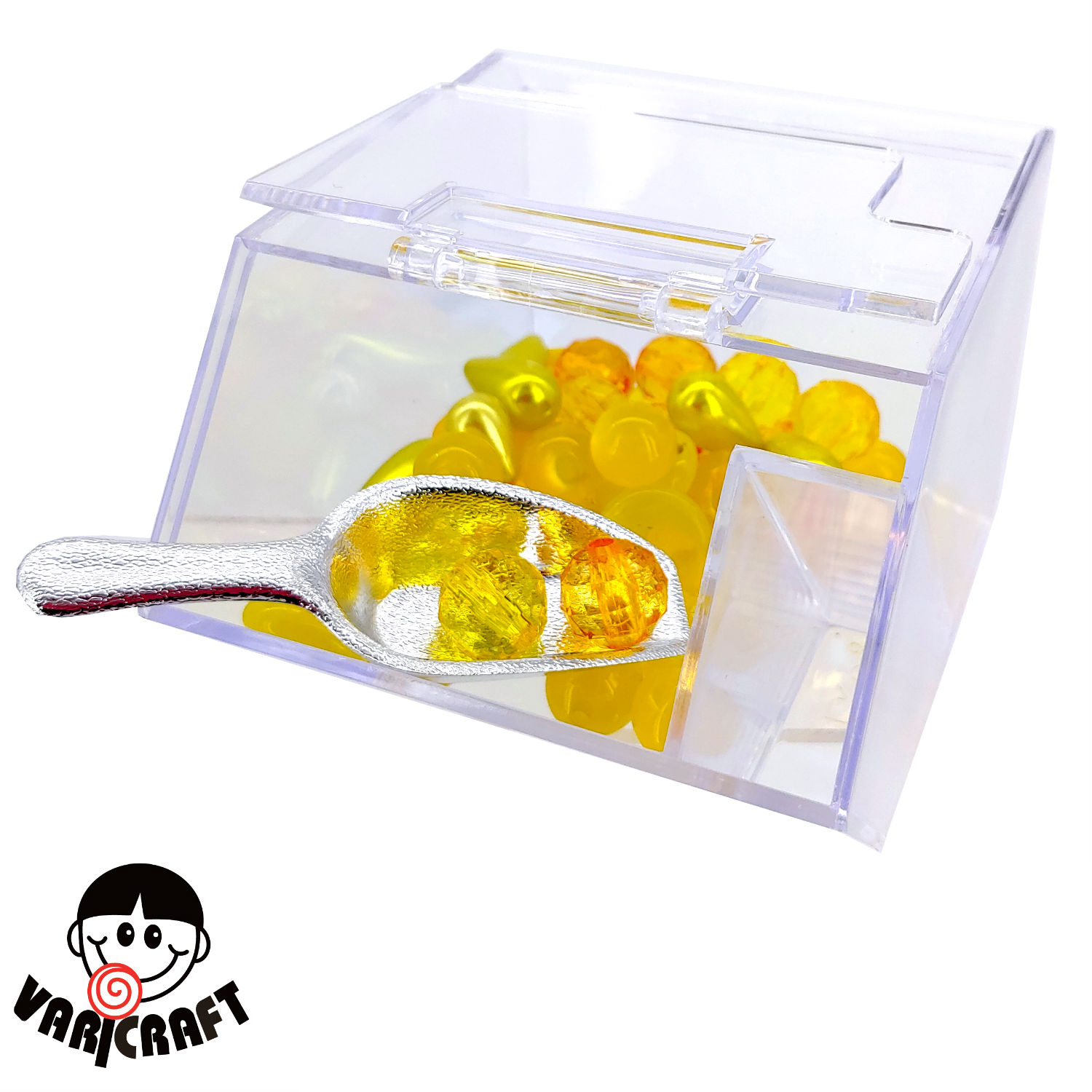 • Features: Candy dispenser; box; container; gift box; candy box; candy container; transparent; clear; rigid plastic packaging container; food grade; reusable; recyclable; with silvery scoop; spoon; with hinged lid