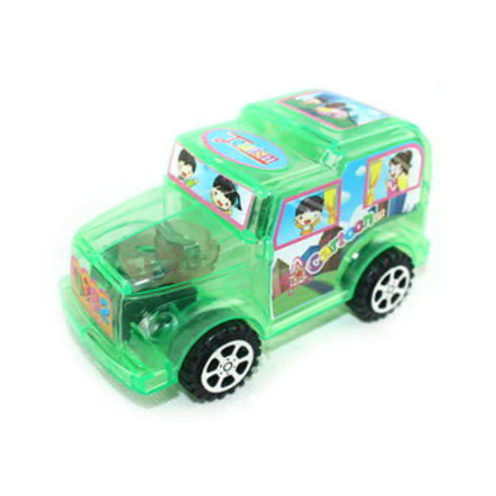 This is a toy car made of robust plastic. It features a semi-transparent body in bright green. It is stuck with colorful cartoon prints on the body for added cuteness.