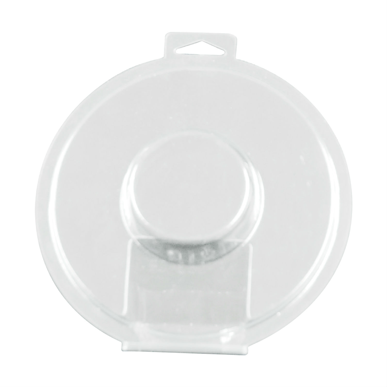 This plastic clamshell comes in a round shape and has a hole on top for hanging. The clamshell is durably constructed and offers a pocket for storage. It is an excellent choice for product packaging and display.