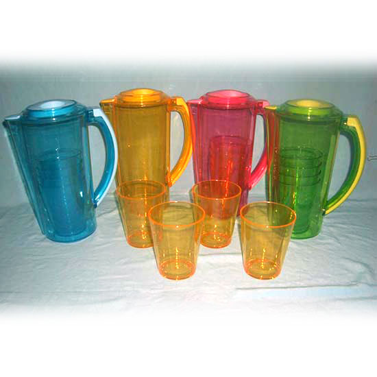 This plastic jug set includes four jugs and four cups with a matching design. All the pieces are made of safe and non-toxic material for ultimate reliability. The ergonomic handle allows a firm and comfortable grip.