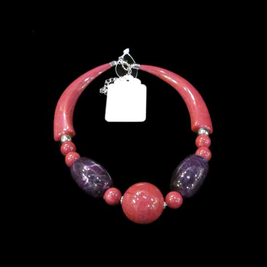 This is a necklace simply chained with coral and purple beads in assorted sizes. Each bead is made of quality plastic with a polished finish. Add charm and glamor to your look with this stylish necklace.