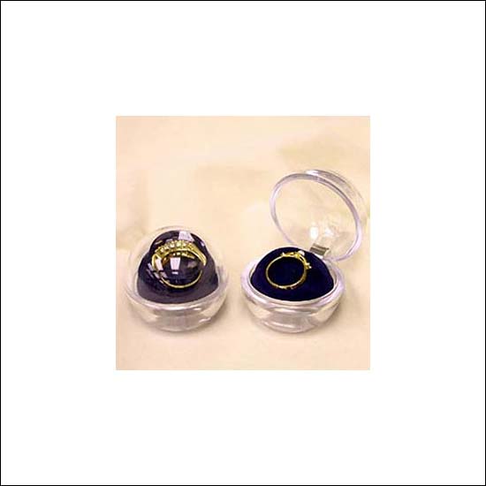 Featured here is a clear plastic box in a circular shape. It is designed for ring holding and has a pillow inside. This plastic box offers a good view of the stored ring and is excellent for display and packaging use.
