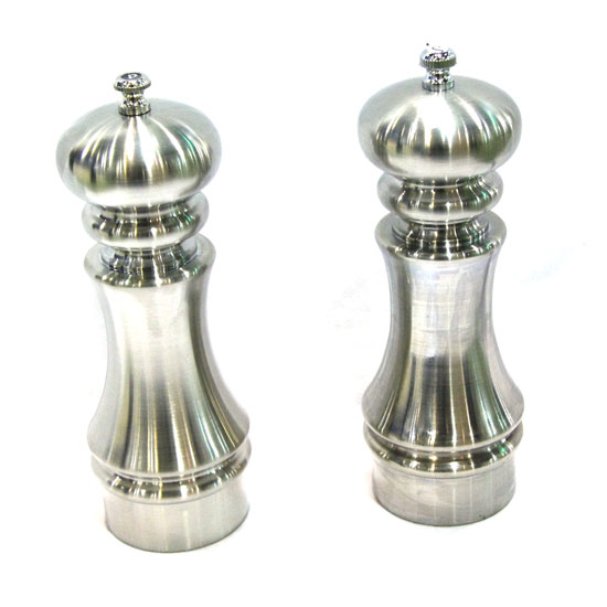 Shown here is a set of salt and pepper mills boasting an elegant design. The mills features an exclusive grinding mechanism to minimize waste. The curvy shells are plated in silvery with beautiful shines.