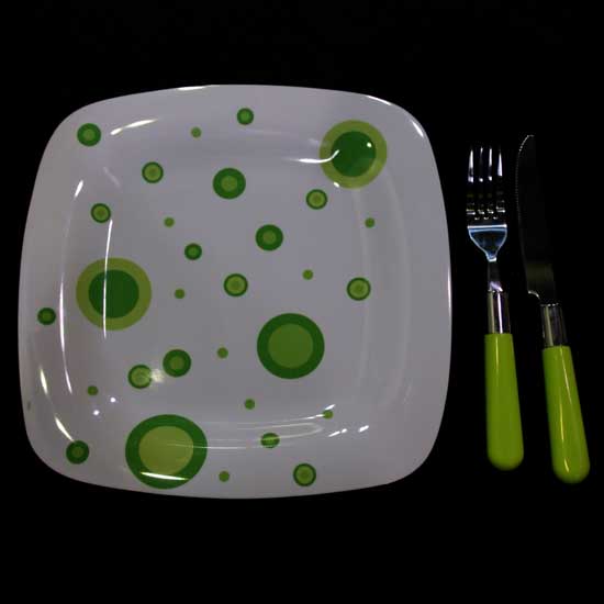 • Set includes: plate, fork, knife.