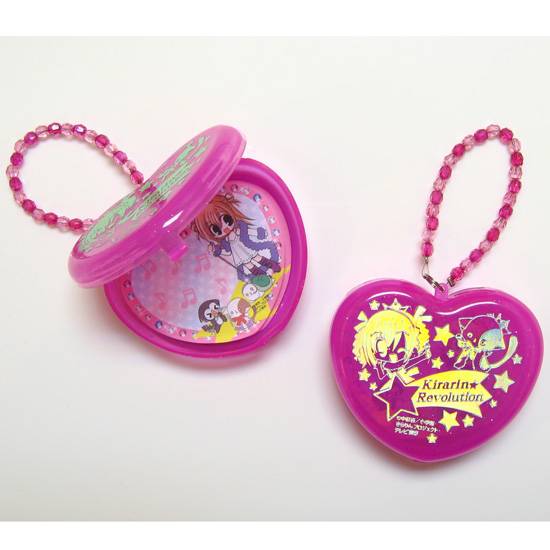 Shown is an attractive plastic gadget particularly designed for little girls. It is a flip open box, featuring a heart-shaped layout in sweet pink to underlines an endearing aura. The little box is attached with a beaded string, making it an eye-catching accessory to be hanged on the handbag.