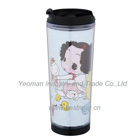 The presented tumbler features a lovely printing which makes it a great item for your kids to school. You can change and design you own tumbler by inserting pictures and photos of your own choice into the slot. The plastic lid safeguards your beverage and prevents dirt and dusts from falling inside the tumbler. This functional tumbler is surely the best companion at school and office.