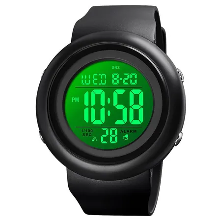 This digital watch has a round case made of plastic and has a display with LED light for easy reading. It offers accurate time keeping and provides addition functions like chrono, alarm, date, week and countdown. The digital watch is equipped with a plastic strap to provide a flexible fit and is great for casual everyday wearing.