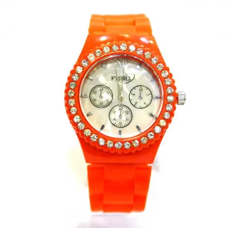 Designed with a youthful style, this watch appeals to young people. With a pseudo bezel insert decorated with round, sparkling stones, this watch flaunts a touch of glamour. Featuring a sharp solid color and lightweight materials, this watch is an energetic accessory.