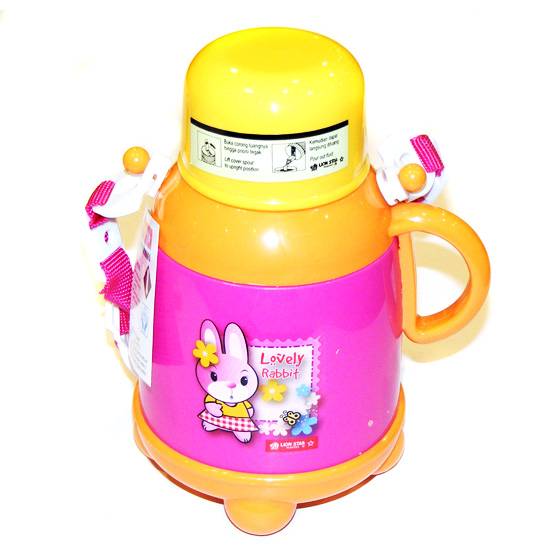 Useful water bottle with well designed cartoon animal paints is made of solid plastic, a nylon cord is attached for easy carrying, safety instruction sticker is located on the bottle cap