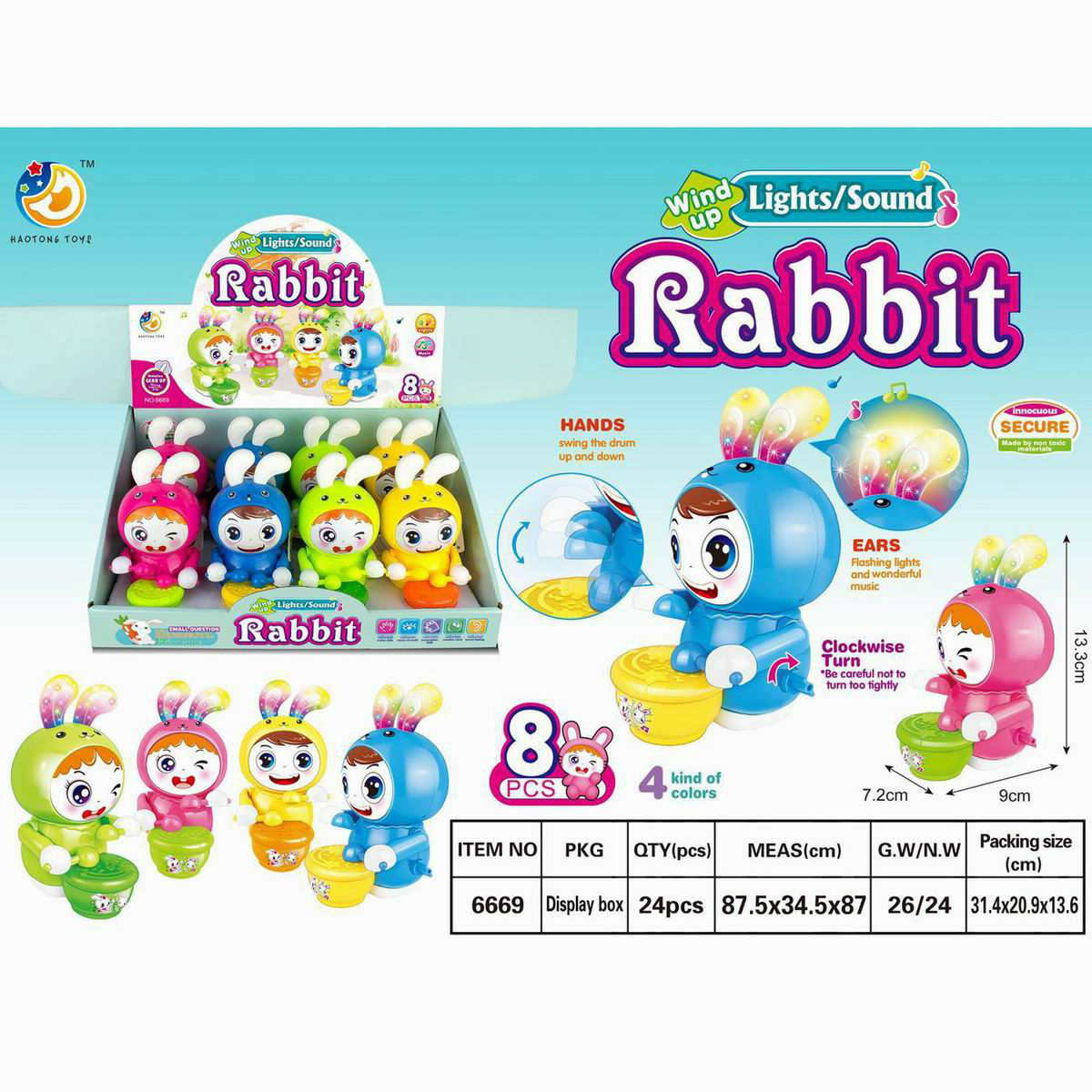 Description: Plastic wind-up rabbit with light & sound 8pcs