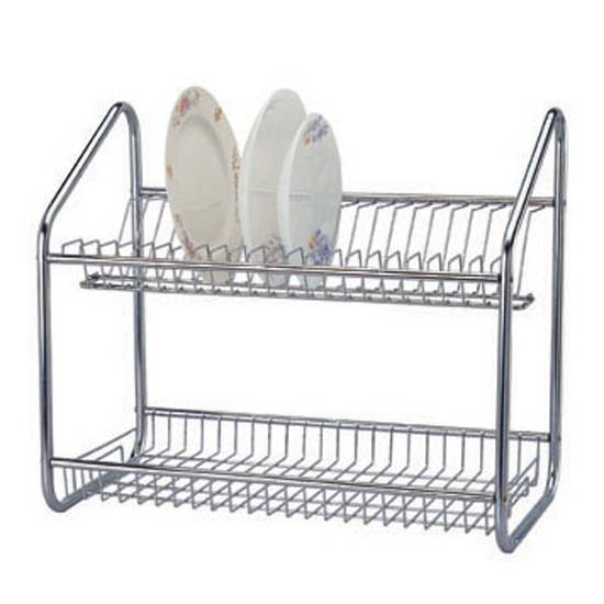 This is a plate holder made of chrome plated steel for household kitchen use. The rack is divided into two tiers which can hold more than twenty plates vertically on each tier. With handles on both sides, the holder can be moved easily and conveniently.