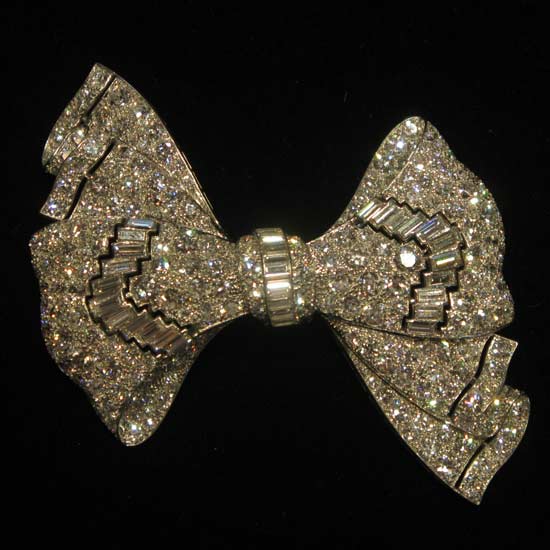 The sophisticated ladies' brooch flaunts a bow-shaped setting crafted with top-grade platinum. Meticulously sculpted with diamonds, this stunning brooch showcases long-lasting shine with brilliant radiance. Striving for perfection, this platinum diamond brooch makes a one-of-a-kind piece of jewelry for accentuating your evening dresses.