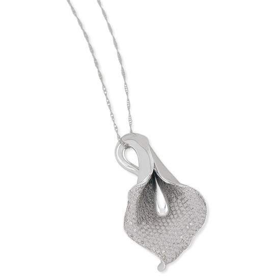 This platinum pendant has beautiful flower design. It has micro set gemstone in white color and a narrow teardrop shape platinum inside. The outer parts of this pendant is well polished up to make it smooth and shiny.
